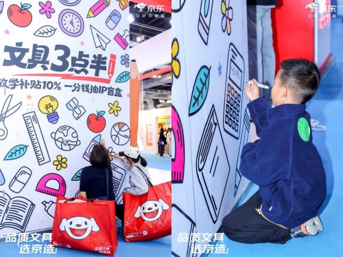 京东京造展区凭借丰富的产品陈列与场景化体验吸引了众多观众驻足。“快乐成长”专区模拟儿童学习空间,配备学习桌、护眼台灯、绘本书架等,为家长提供一站式学习场景解决方案;“开学必备”“学习记录”“考试刷题”三大区域精准对接学生需求,从笔袋、中性笔、笔记本到专业绘图工具,品类齐全,吸引不少学生与家长现场试用;“时尚办公”专区则聚焦职场人群,简约大气的文件收纳与高效办公套装尽显品质,深受职场人士青睐。京东Joy IP互动区更是人气高涨,丙烯马克笔、儿童彩沙、超轻粘土等创意文具与Joy形象巧妙融合,成为亲子家庭流连打卡的热门区域。